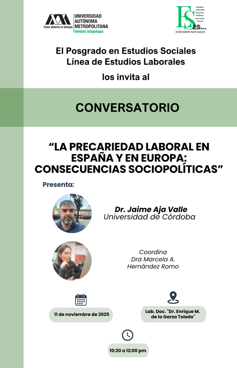 El Posgrado en Estudios Sociales, Línea Estudios Laborales, les hace la cordial invitación al conversatorio “La precariedad laboral en España y en Europa: consecuencias sociopolíticas”, el cual será presentado por el Dr. Jaime Aja Valle (Universidad de Córdoba), quién se…