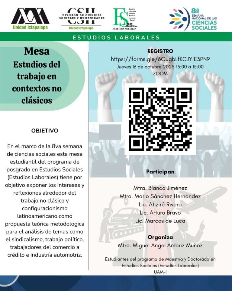 El Posgrado en Estudios Sociales, Línea de Estudios Laborales, les invita a la mesa: “Estudios del trabajo en contextos no clásicos”. Fecha: 16 de octubre Hora: 13:00 hrs Modalidad: En línea, vía Zoom Este evento está organizado por estudiantes de…